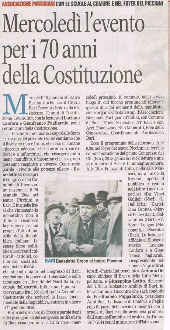 Nell’anno scolastico 2017-2018 si sono già svolti – a cura del Comitato Provinciale barese dell’Associazione Nazionale Partigiani d’Italia e d’intesa con i docenti – incontri nelle scuole per illustrare la genesi e i caratteri nuovi del testo fondamentale della Repubblica, e ulteriori incontri sono previsti nei mesi prossimi.