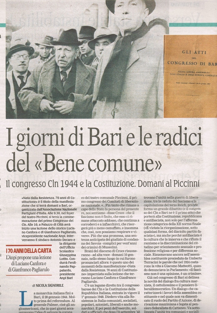 Alle 9,30, nel foyer del Teatro Piccinni, si è tenuta la commemorazione del primo Congresso dei CLN (Bari, 28-29 gennaio 1944): in quel primo consesso antifascista e democratico in Italia e in Europa (riunito proprio nel Teatro Piccinni 74 anni fa) si riconosce la premessa se non proprio l’atto di nascita della Repubblica Italiana.