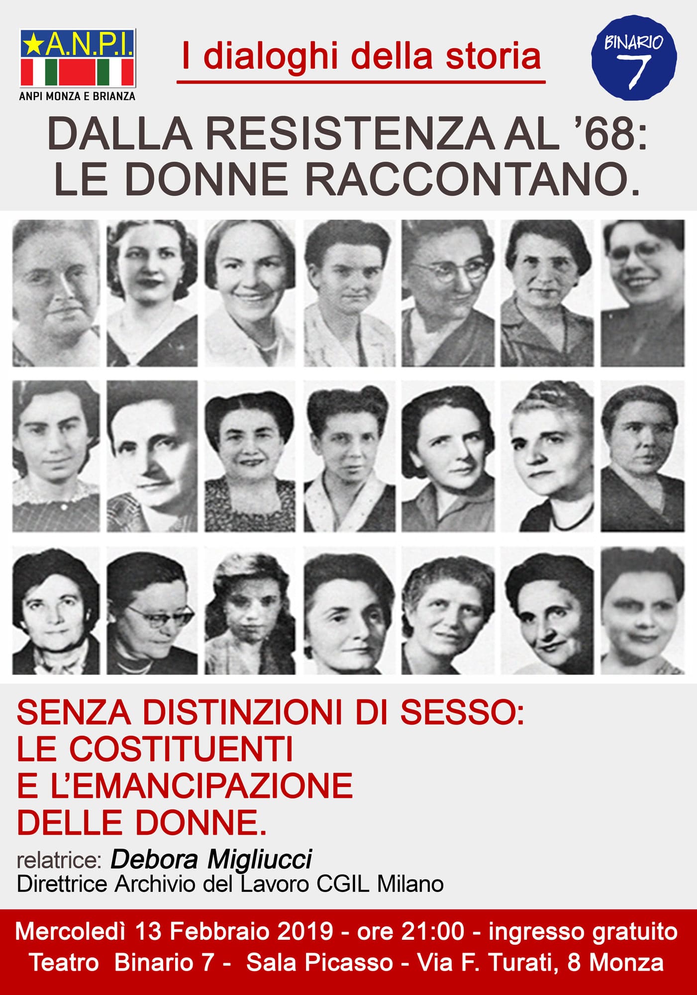 “Non dimenticare mai che una crisi politica, economica o religiosa sarà sufficiente per mettere in discussione i diritti delle donne. Questi diritti non saranno mai acquisiti. Dovrai rimanere vigile per tutta la vita”. Questa frase di Simone de Beauvoir rappresenta appieno il motivo per cui l’Anpi Monza e Brianza ha deciso di dedicare al lungo cammino, non ancora concluso, delle donne verso la parità il ciclo di quattro serate “I dialoghi della storia. Dalla Resistenza al ’68: le donne raccontano”, al Teatro binario 7 (ex luogo di tortura fascista). Pur consapevoli che quattro incontri non saranno sufficienti per raccontare tale percorso, possono però rappresentare uno spunto di riflessione.