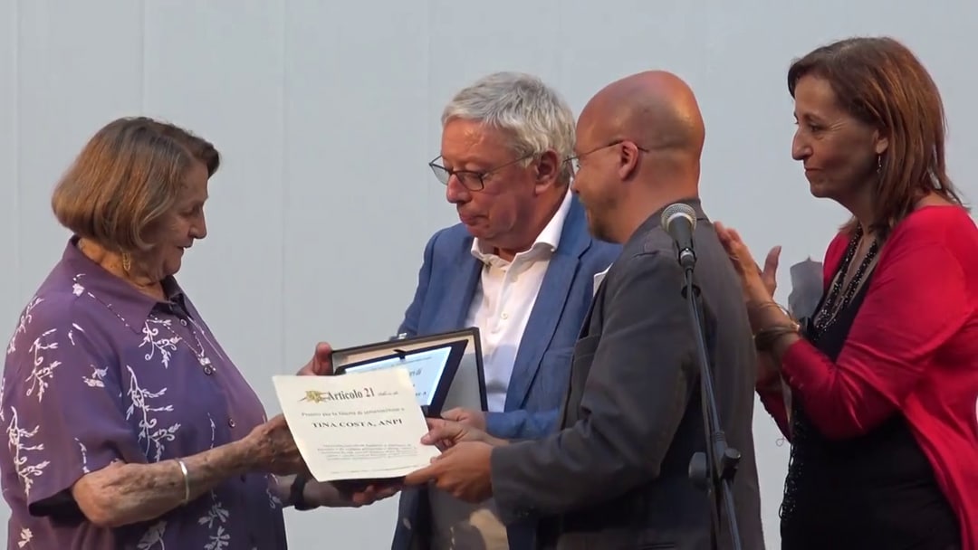 Dopo l’intervento di apertura, affidato al presidente Fnsi, Beppe Giulietti, Corradino ha invitato a salire sul palco proprio Tina Costa e, come in ogni premiazione che si rispetti, le ha consegnato la targa leggendo la motivazione: “Ha cominciato fin da bambina a ribellarsi al fascismo e da staffetta partigiana e donna libera ha trascorso la sua vita all’insegna della Resistenza, contro i vecchi e i nuovi fascismi e ogni forma di intolleranza, prevaricazione e discriminazione”. Poi accanto a Elisa Marincola, portavoce nazionale di Articolo 21, ha preso la parola Vincenzo Vita, presidente della fondazione Archivio Audiovisivo del Movimento Operaio e Democratico. «Oggi più che mai è necessario salvaguardare la nostra memoria, la memoria attiva – ha detto Vita – ed è un onore consegnare questo premio a Tina Costa perché non rappresenta il passato, ma un ammonimento dell’oggi a resistere. E grazie a Tina e alle persone come lei, ce la faremo».